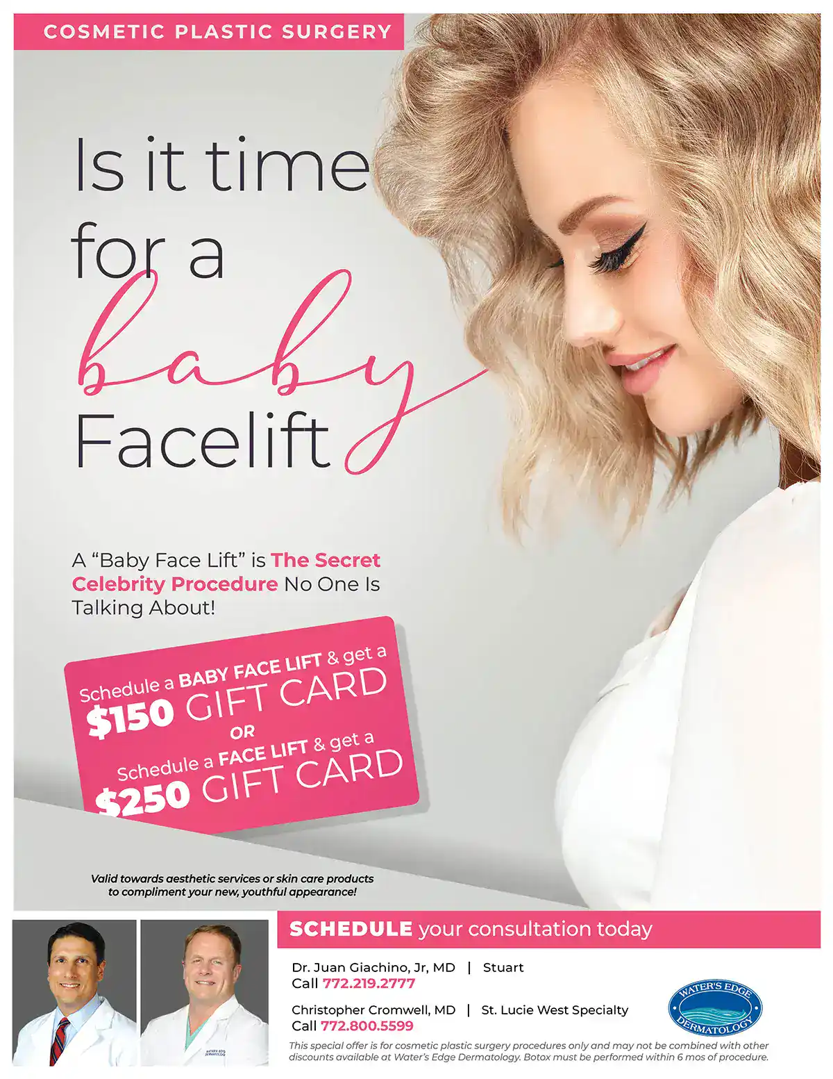 - This offer is for cosmetic plastic surgery procedures only and may not be combined with other discounts available for Water’s Edge Dermatology. Botox must be performed within six months of procedure.